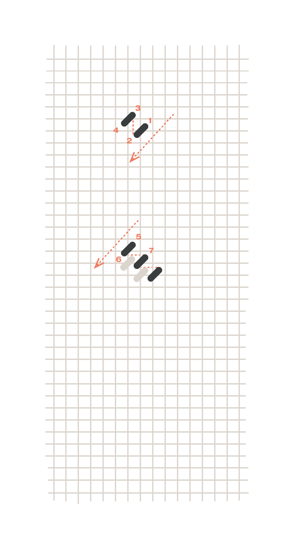 - On the second row return in the opposite direction. Place the tent stitches between those of the first row, by bringing your needle up top right (5) and taking it down one row down and to the left (6).