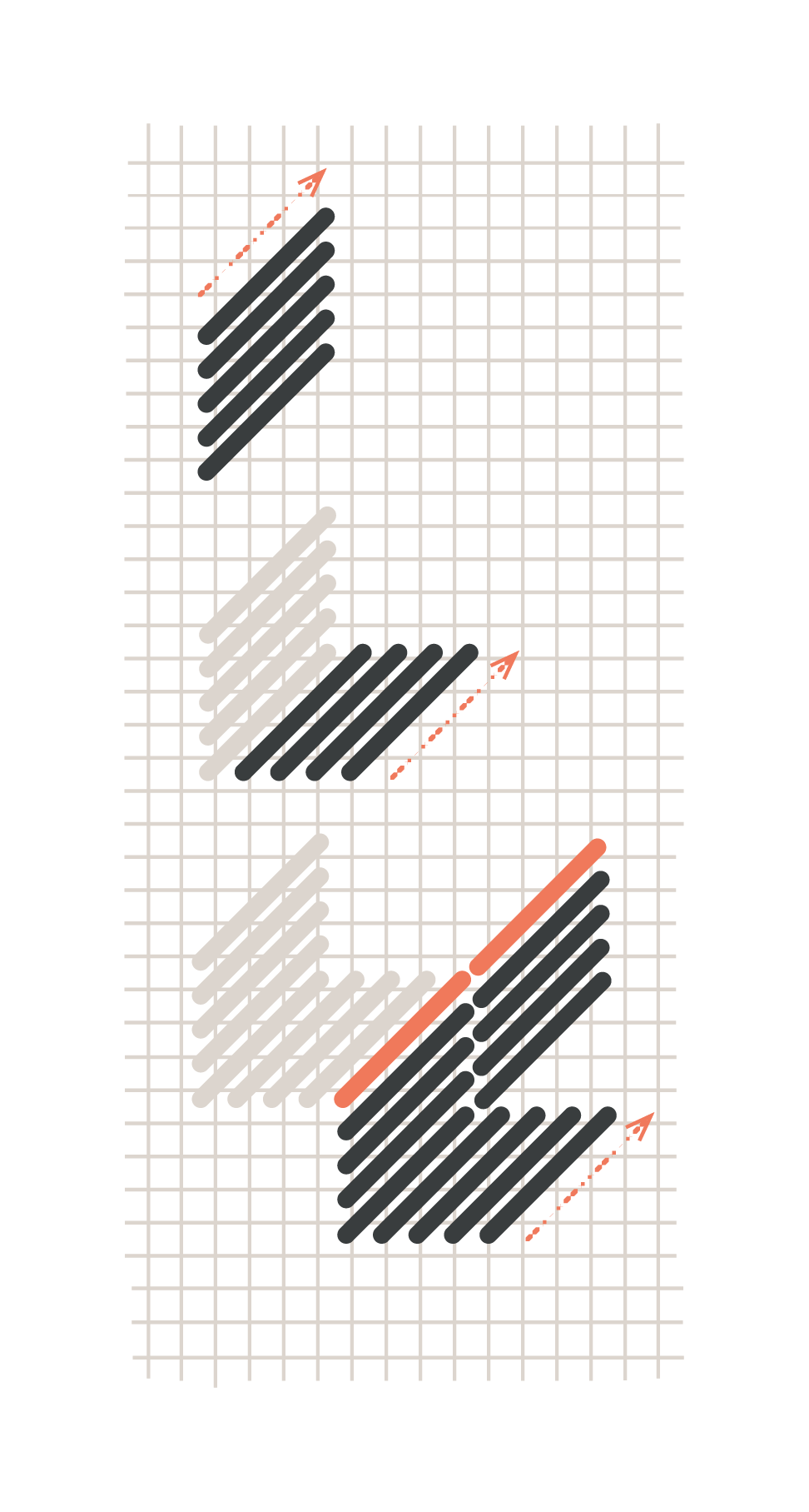 - To begin, sew five diagonal stitches in a column from bottom left to top right across four intersections of the canvas. The bottom stitch will act as the corner stitch.