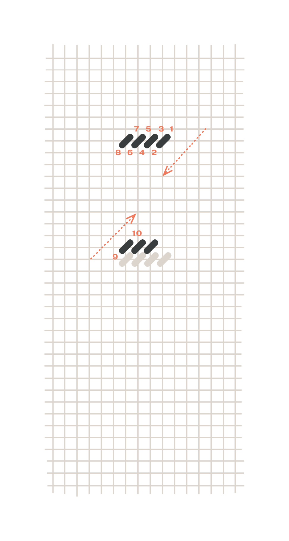- For your second row return in the other direction from left to right. In this direction, the order of the stitch is reversed and so come up from the back of the canvas in the bottom left (9) and cross diagonally over one intersection, going down into the canvas one row up and one column along to the right.